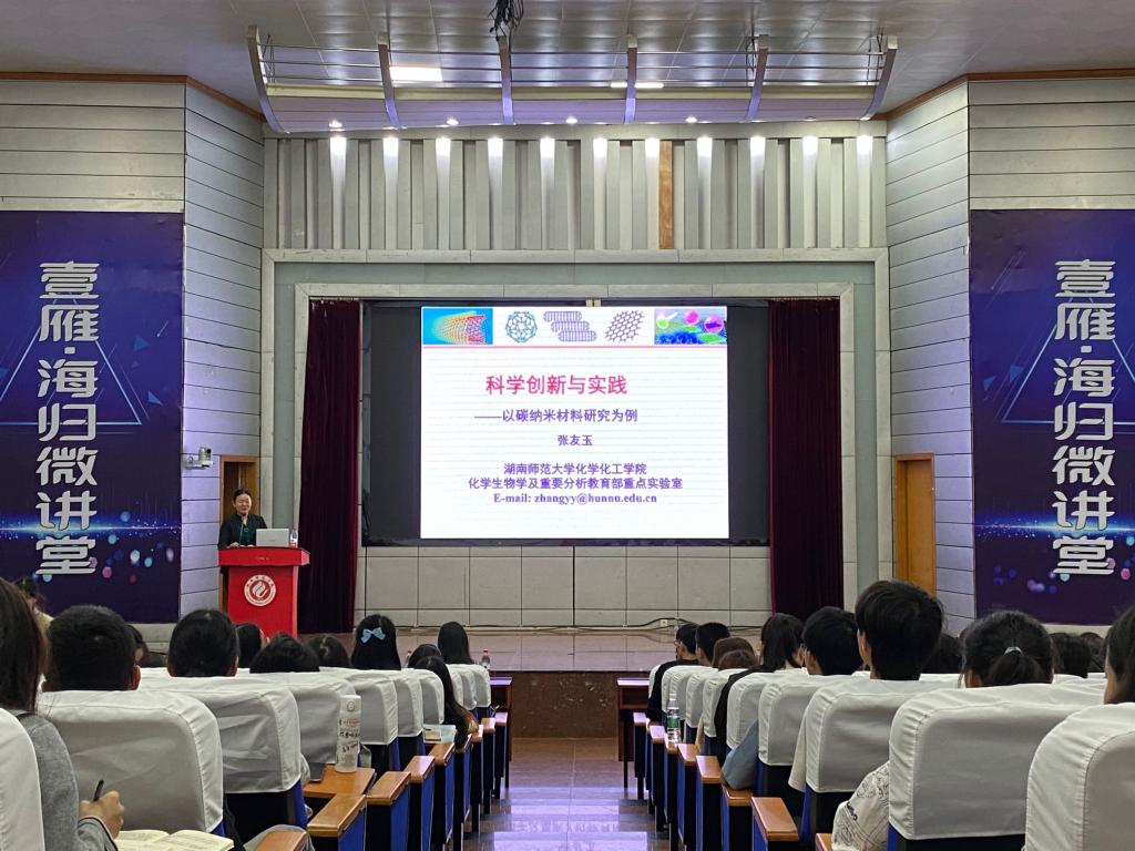 报告中,张友玉教授强调了科学思维的重要性。她指出,科学思维包括四点要素。一是富有激情,研究成果的发现离不开科研工作者对于真相的不懈追求;二要善于捕捉信息和灵感,科研人员应敏锐地从观察和实验素材中发现和提出问题、寻找突破,继而追踪目标、推动研究进程。三是勤于交叉整合,她提到,将不同学科的理论知识相互交叉、整合更能让科研成果实现理论的突破、技术的创新。四要科学总结,张教授说到,要勤于对思考、求证进行总结梳理,使得知识形成体系、能够分享给他人,从而使得价值最大化。随后,她从碳材料的发展概述——石墨烯的发现、荧光碳点的发现、溶酶中氢离子和钾及离子的相关性研究等科研事例的发现、反应机制、实验原理等方面对以上观点进行了论证。