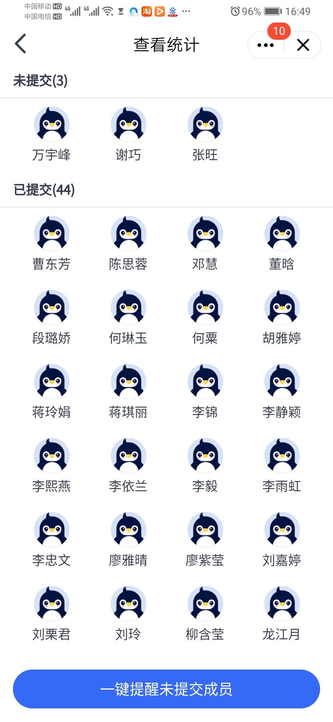 在员工在QQ小程序“老师助手”上提交作业后,老师对员工提交作业情况进行检查并督促员工及时完成网课学习。以刚结束的第六周的课程为例,我在作业提交截止之后,通过“老师助手”软件掌握的2018级生物科学1班、生物科学2班提交作业总体情况,通过查看统计,找到未提交作业的同学。