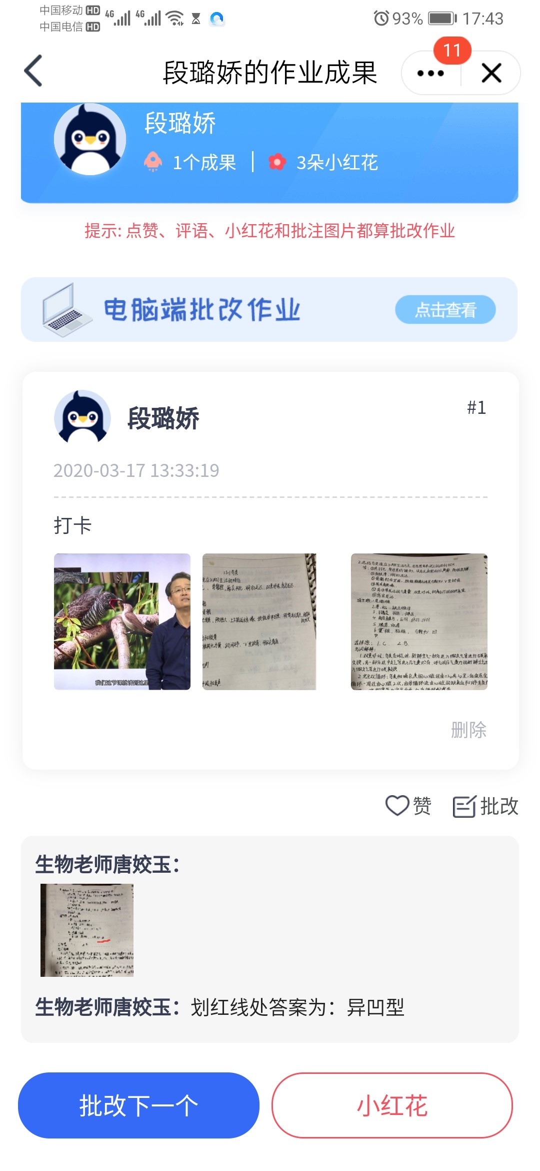 员工作业交齐后,我再对员工的作业情况进行检查,进行批改和批注。下面2图为员工作业及教师批注随机截屏2例。