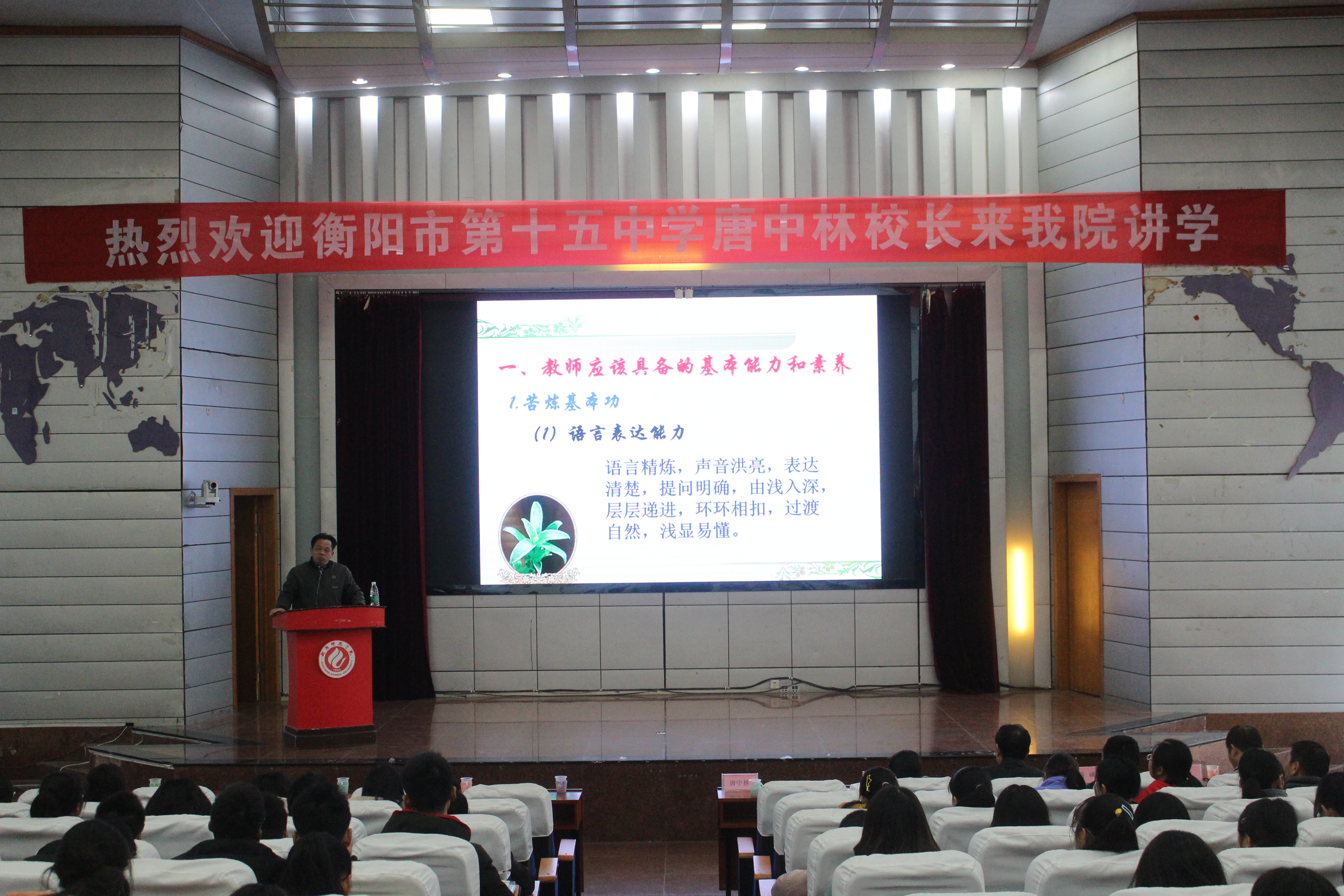 为营造良好的校园学术氛围,加强团队建设,促进学术交流,同时提高公司师范生教学技能,加强师范生对教师行业的了解,12月6日上午10:30,公司特邀请衡阳市第十五中学董事长唐中林在西校区学术报告厅做了题为《做一名幸福的中员工物教师》的学术报告。报告会由太阳成集团tyc234cc经理曹丽敏主持,党总支书记彭晖,副经理易诚、杨海及师生代表约200余人聆听了本次讲座。