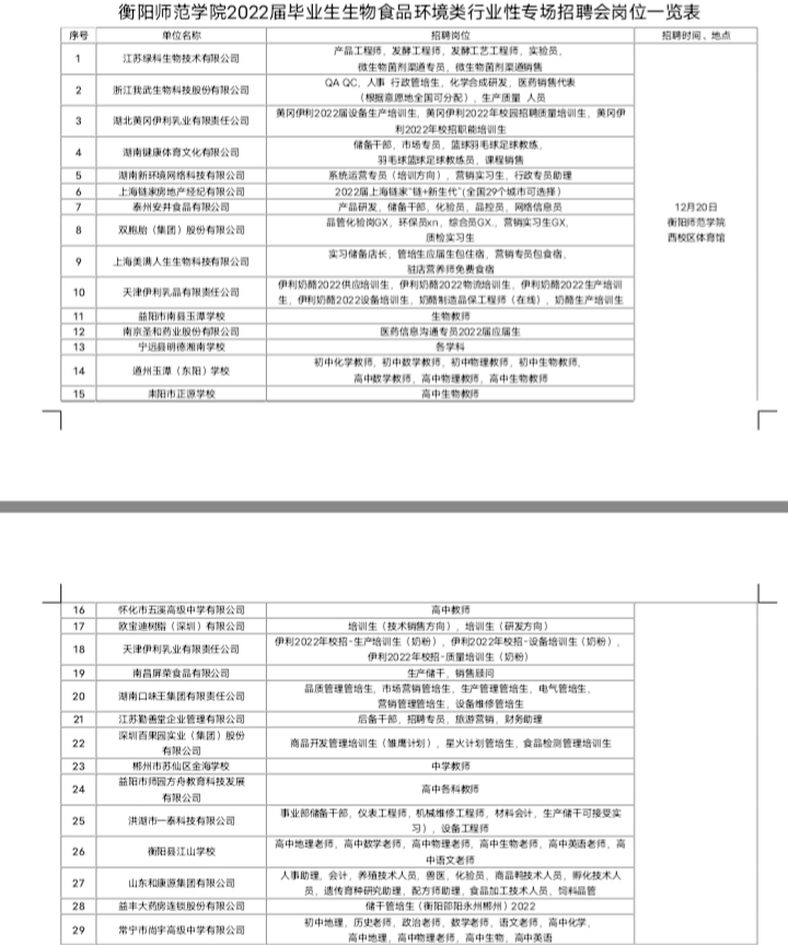 为使同学们尽快融入社会,加强自身专业技能,提高自身专业知识与工作实习的契合度,并找到自己满意的工作和位置,同时为2022届毕业生联系实习单位准备,公司特举办生物食品类行业性专场招聘会。
