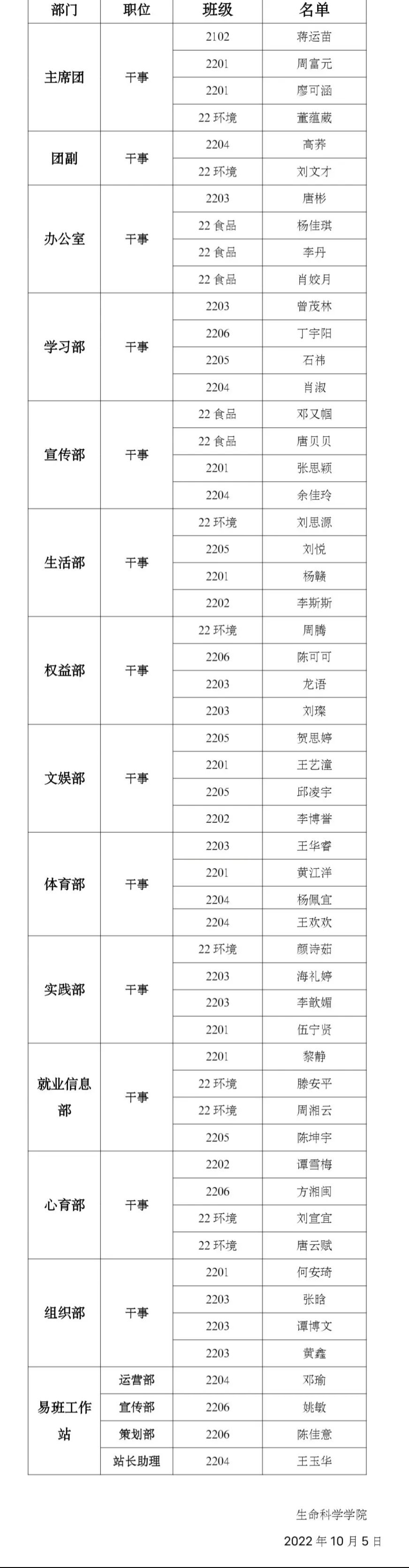 经个人竞演、公司选拔、团委讨论决定,拟招以下同学为第十五届团委员工分会主席团干事及各部门干事,现将考察名单予以公示。公示时间为10月5日-10月10日,欢迎全院师生反映公示对象存在的问题。(反映问题请联系QQ:2280310193,届时考察小组将对反映问题进行核实并做出答复)