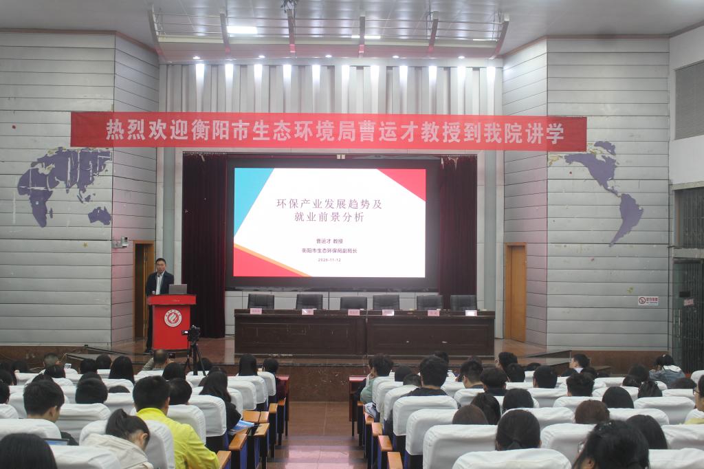 11月12日晚七点半, 太阳成集团tyc234cc于西校区模拟法庭举行“环保产业发展趋势及就业前景分析”讲座,湖南省衡阳市生态环境局副局长曹运才教授任主讲人。公司党总支书记彭晖,副书记蒋湘祁,经理曹丽敏,副经理易诚、杨海,公司专业教师及食品环境专业同学参加了此次活动。