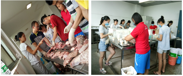 在中科院亚热带研究所,我们主要做了两件大事:一是湘村黑猪肠道采样;二是用采取得样品做一些实验研究。接下来我将这两项工作详细阐述。首先是屠宰场采样,我们当时是在宁乡经济开发区的屠宰场采样,流水线的屠宰速度十分迅速,也可以用干净利落形容,屠宰场分工十分细。我们当时共需要屠宰40头110kg的实验湘村黑猪,采样共20人,采集样品包括(血液,胃、肝脏、胰腺、背最长肌、股二头肌、背脂、腹脂,空肠、回肠、盲肠、结肠及其黏膜和食糜)。称重样品包括(胴体,皮,骨骼,肌肉,脂肪,腿臀,心,肝,脾,肾,板油,肾周脂),而我们当时负责的是最脏最臭的工作,即采四个肠道的食糜。(食糜指食物经过口腔内牙齿的咀嚼、舌搅拌与唾液混合,吞咽进入胃后,由于胃壁肌肉运动把食物磨得更碎,并与胃液充分混合,形成粥一样半液体状的物质,其实就是shi)。以下是采样的一些图片: