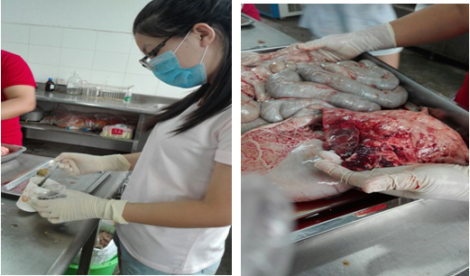 实采样是一门技术活,首先,得根据所学的知识分清楚肠道的每一段是什么,比如连接胃的是十二指肠,然后是空肠、回肠、盲肠、结肠。然后就是刮粘膜,必须使用生理盐水洗肠道,你们知道为什么吗?因为要维持渗透压平衡!当然不止是采肠道需要技术,其中分离肌肉也是一门真正的学问,这次我们很荣幸的一睹华中农业大学的博士专门过来分离小腿肌肉,他们的手法真的很娴熟,真的是台上一分钟,台下十年功啊!