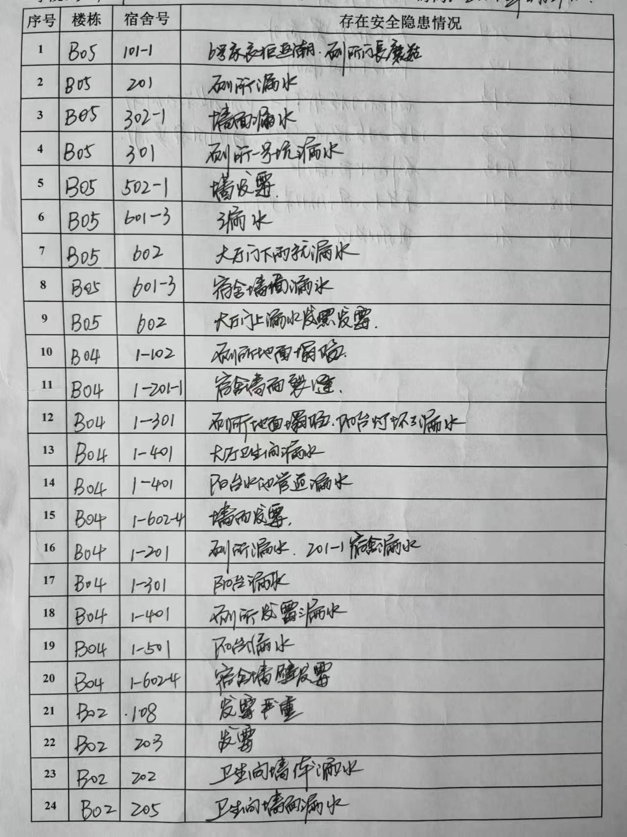 为确保排查工作深入细致,公司采取每个宿舍过一遍,每个房间查一遍的形式,拉网式排查。每到一个宿舍,深入每个房间,查看每个角落,询问每名员工,看是否存在安全隐患,是否有不安全的苗头,是否存在困难问题,并结合当前发生的安全事故,对员工进行随机安全教育,普及安全常识。特别是对用电安全、消防安全等做出强调。同时,对排查过程中存在安全问题详细记录,并明确整改时限。对排查中发现的私自移动书桌衣柜限本周内回归到位,对存在卫生间阳台管道漏雨、厕所门栓不稳固、风扇损坏、灯管不亮等问题及时报修,对墙体发霉、地面返潮、衣柜床板潮湿等问题提醒同学们及时晾晒衣被,宿舍保持通风透气,保持宿舍卫生。