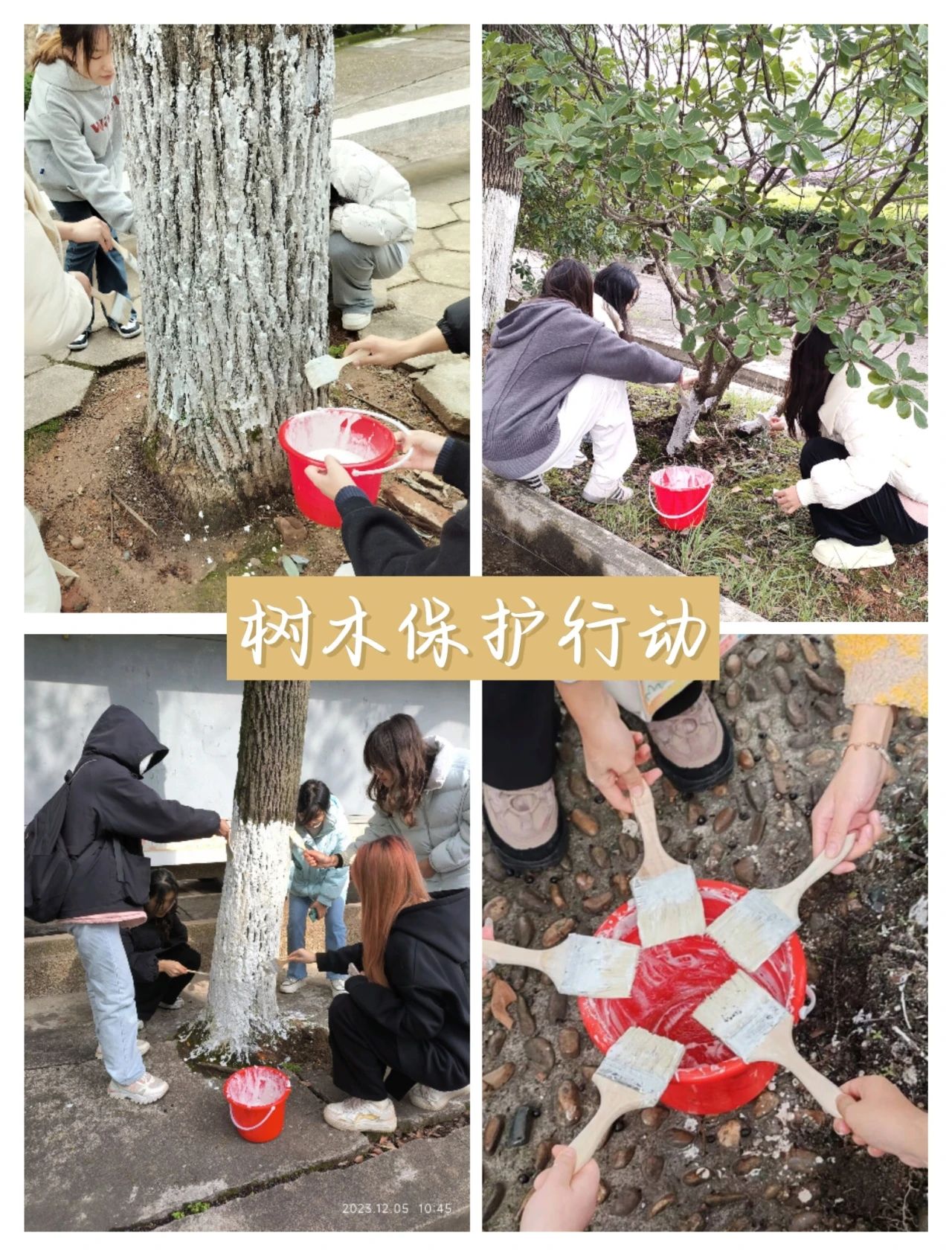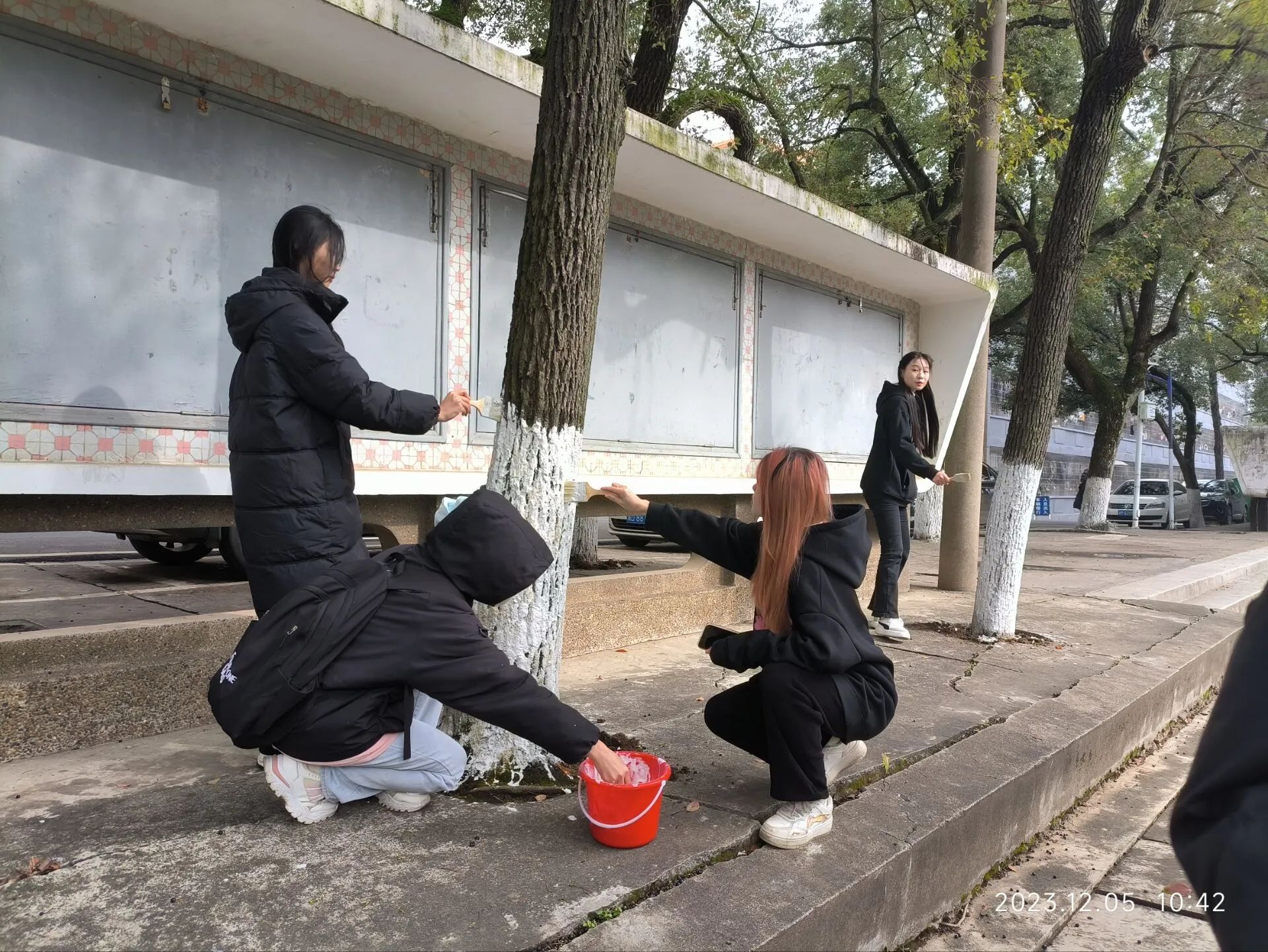 活动内容:志愿者们为太阳成集团tyc234cc西校区校园内的树木涂抹石灰水,为其防虫、保暖。
