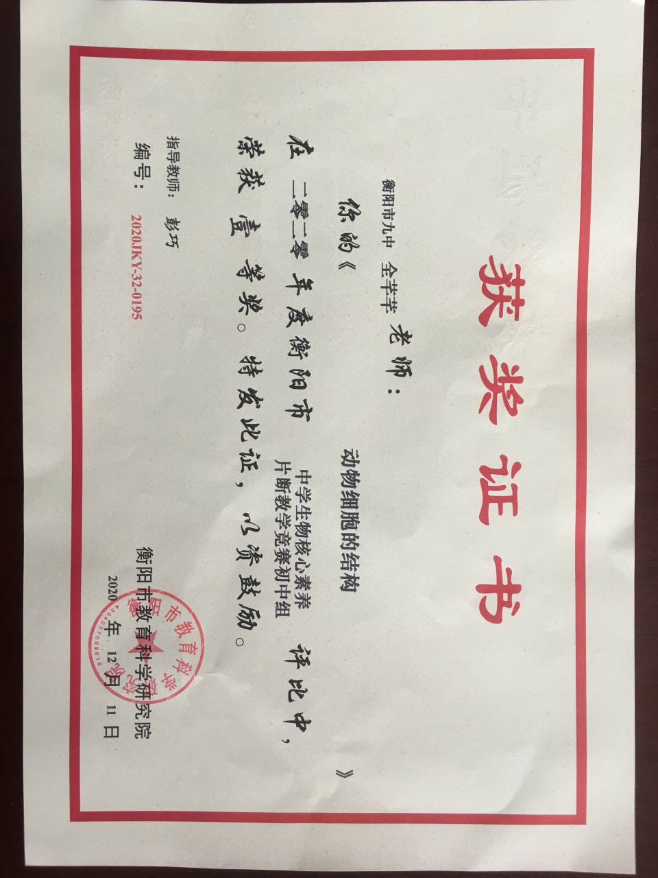 二.获奖情况:由衡阳市教育科学研究院主办的“2020年衡阳市中员工物核心素养片段教学比赛”中获得一等奖。