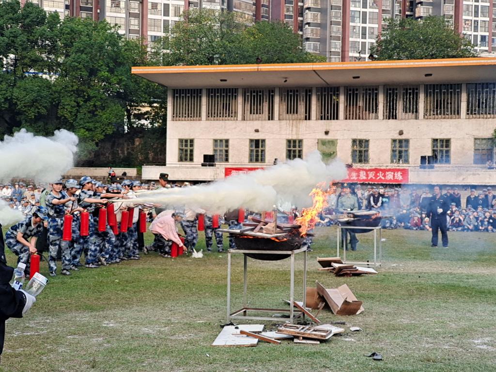 最后,教官讲解消防安全知识、并且使用标准的动作对灭火器用法进行了相应的说明。随后,同学和教官一同使用灭火器来进行灭火,紧接着消防演练结束各连分别带开,继续训练。