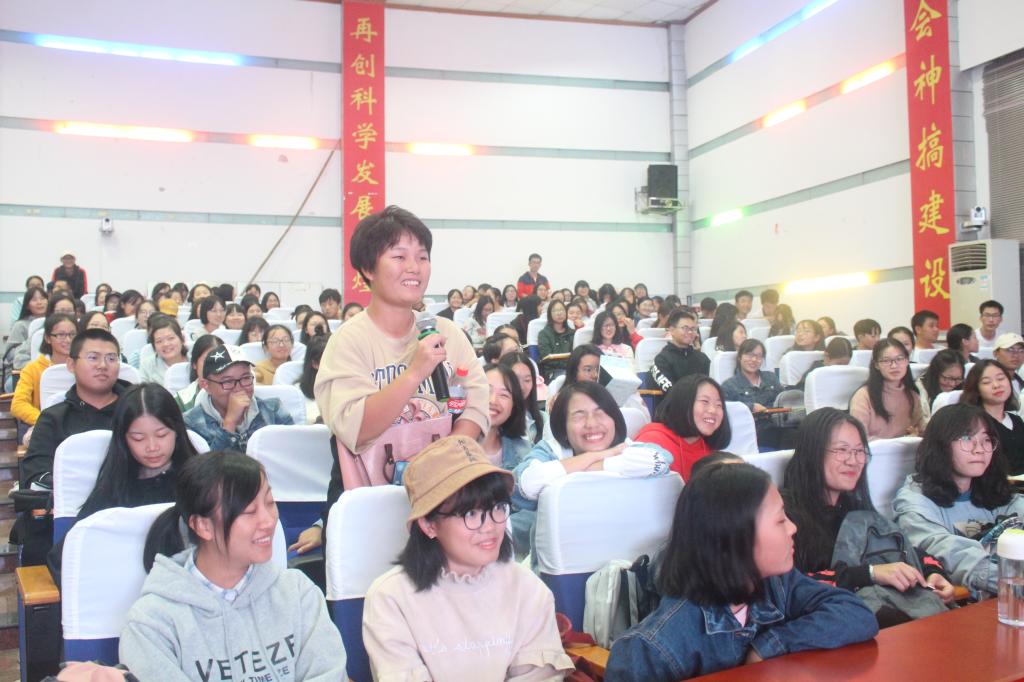 接着,她讲述活出全新的自己之“连融”问题:从人生成长的主要阶段及在系统中连融的主要内容,即正确处理“与父母的关系、与自己的关系、与他人的关系”。她强调,良好的人际关系和在集体中的沟通能力影响着老员工形成和发展健康的个性品质。为了让同学们更切实体验在老员工活中“连融”的重要性,老师邀请了两名同学上台示范“讨好、指责、依靠、关注”等四个两两互动的动作,并鼓励台下的同学勇敢地向旁座的同学进行这个互动活动,现场积极热烈,各班同学争先分享自己的体验与感受。