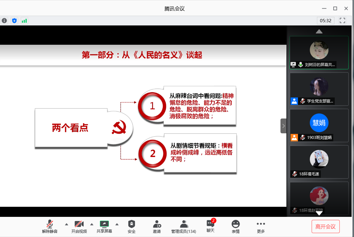 在其后的线上小组讨论中,学员们纷纷发表自己的培训感悟与收获,1905班的罗佳欣说道“通过党课培训,更让我明白了全心全意为人民服务的宗旨,并不是纸上谈兵,更不是夸夸其谈,而是付诸行动,以小我成就大我。”关于共产党员的奉献精神,19级食品班的金丹妮说道“这次疫情,抗战在一线的党员,让我体会到有一种精神叫奉献,有一种力量叫鼓舞,有一种感动叫震撼,他们是我们身边极其普通的一员,但在他们身上展现了中国共产党信仰最朴素的一面——责任和担当。”
