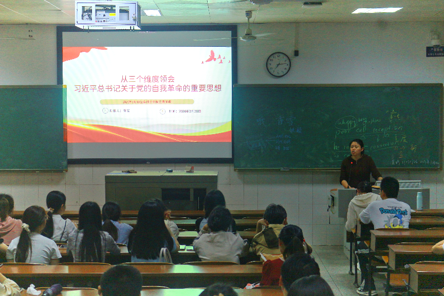 党课活动结束之际,付蓉老师对此次党课进行了总结,她强调各位党员同志们一定要将习近平总书记关于党的自我革命的重要思想真正做到内化于心,外化于行。要多了解时事,多了解近段时间新提出来的概念、方针和政策,做到与时俱进。要多进行自我革命,改正自己的缺点,并且要真正发挥党员的先锋模范作用,去影响他人,带动他人,要做到无愧于自己的共产党员的称号。