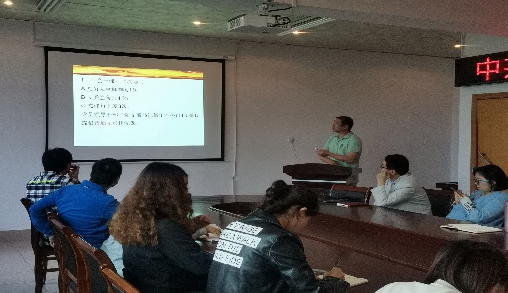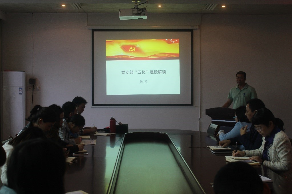 10月16日下午五点半,太阳成集团tyc234cc于西校区千禧楼六楼会议室组织开展教工支部学习会。经理曹丽敏、副经理易诚等教师党员到场进行学习,副经理杨海作题目为《党支部“五化”建设解读》的理论学习报告。