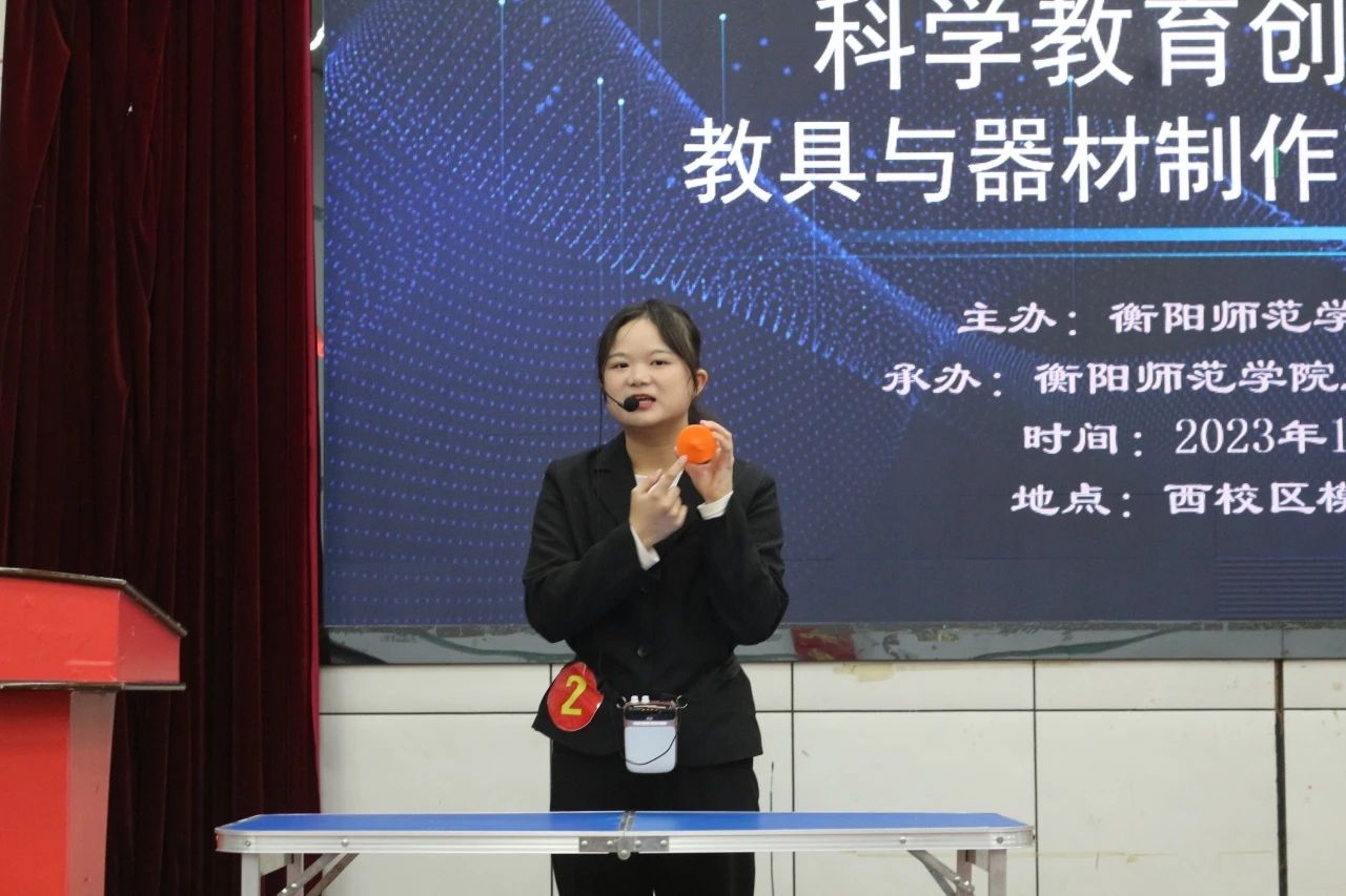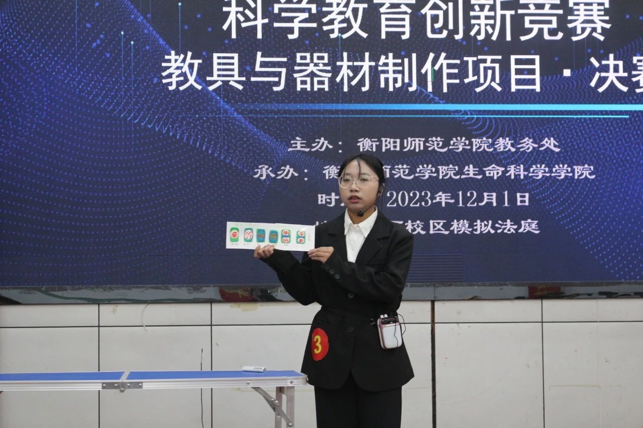 决赛伊始,主持人介绍比赛规则。本次比赛分为两大项,分别是教具与器材制作项目和教学创新项目,选手依次上台展示比拼。选手们手持自己制作的教具讲解其制作过程及用途,条理清晰;进行实验操作,游刃有余;站上讲台即席演讲,妙语连珠;进行模拟授课,落落大方。踔厉笃行助远航,以赛促教竞芬芳。比赛紧张而激烈,每一位选手都全力以赴,富有创新性的教学方式与多媒体等技术相结合,博积勤研以推新,为我们呈现了一场精彩绝伦的比赛。评委老师认真观看每位选手的展示内容,聆听选手的讲述。
