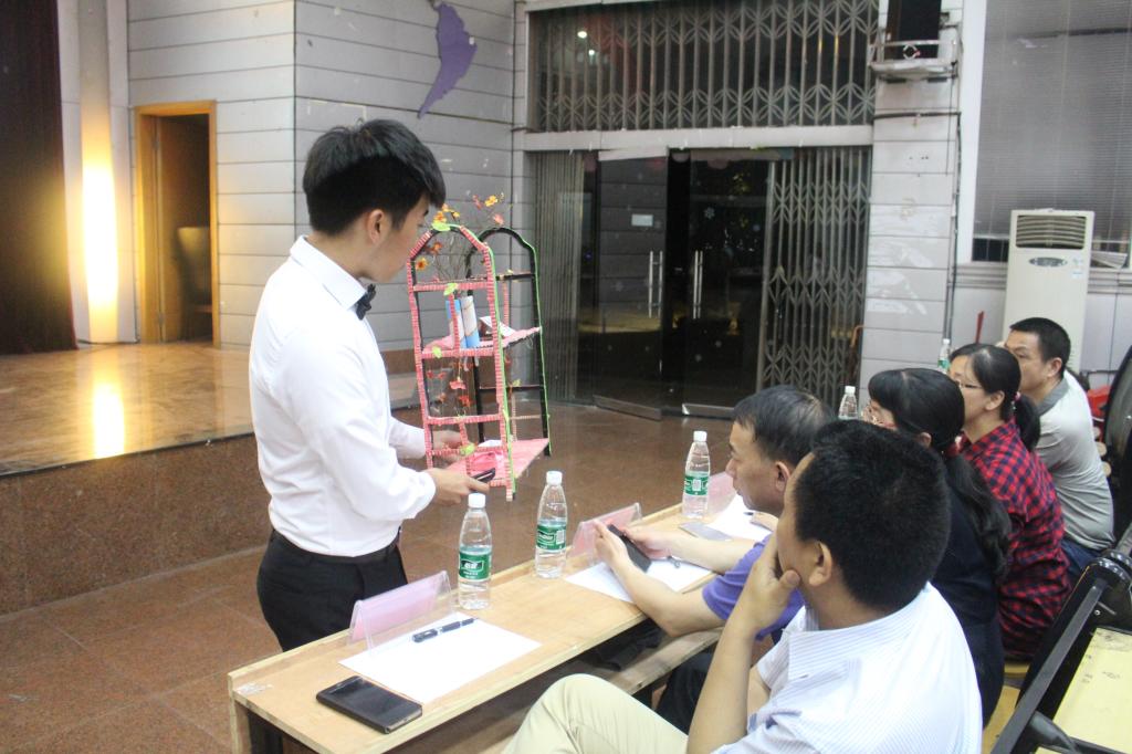 此次比赛分为作品展示、现场答辩、评委提问三个环节。参赛队伍从设计理念、使用性能等方面对自己的作品做了详细的介绍。评委从环保、美观、创意构思等角度对同学们的作品一一评分。旧快递盒、废弃瓶盖、毛线、铅笔屑等人们随意丢弃的废旧物,在员工的巧手中摇身一变成为精美的工艺品。糖果盒与旧格子布制成的精美储蓄罐,旧木板上创作的毛线画,快递盒、废弃墙纸结合制成简易书架,废旧牛仔裤裁剪成别致的小挎包,用铅笔屑粘合而成的跳舞姑娘,各种精美的小制作无一不让在场的评委与观众惊叹其奇思妙想。每件作品还附上设计理念与过程,让参观者能清楚地了解到这些漂亮的手工艺品是如何变废为宝的。最终,16号选手陈金未的作品“晾衣小花架”在一众优秀的作品中脱颖而出,摘得桂冠。