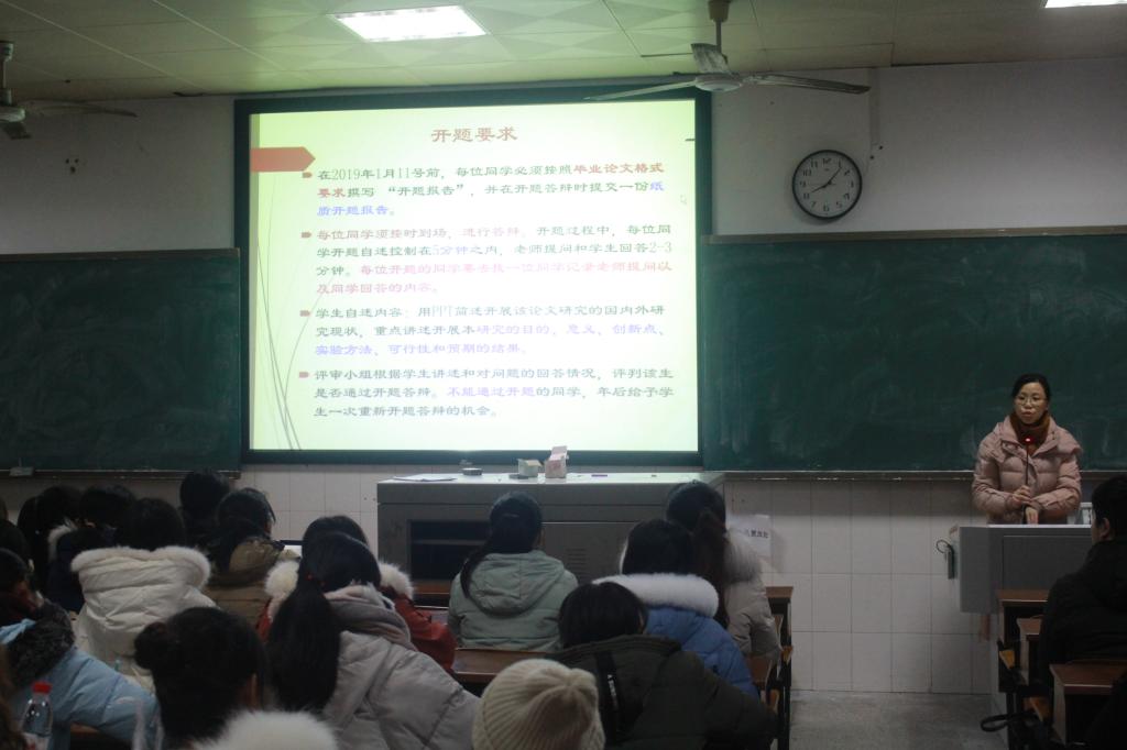 1月11日上午8:00,太阳成集团tyc234cc2019届毕业生学位论文开题报告会准时在西校区外语楼召开。首先于301教室进行了开题仪式,易诚副经理,孙伟峰、刘会敬、陈佩云等相关专业老师,以及2015级全体员工到场参会。