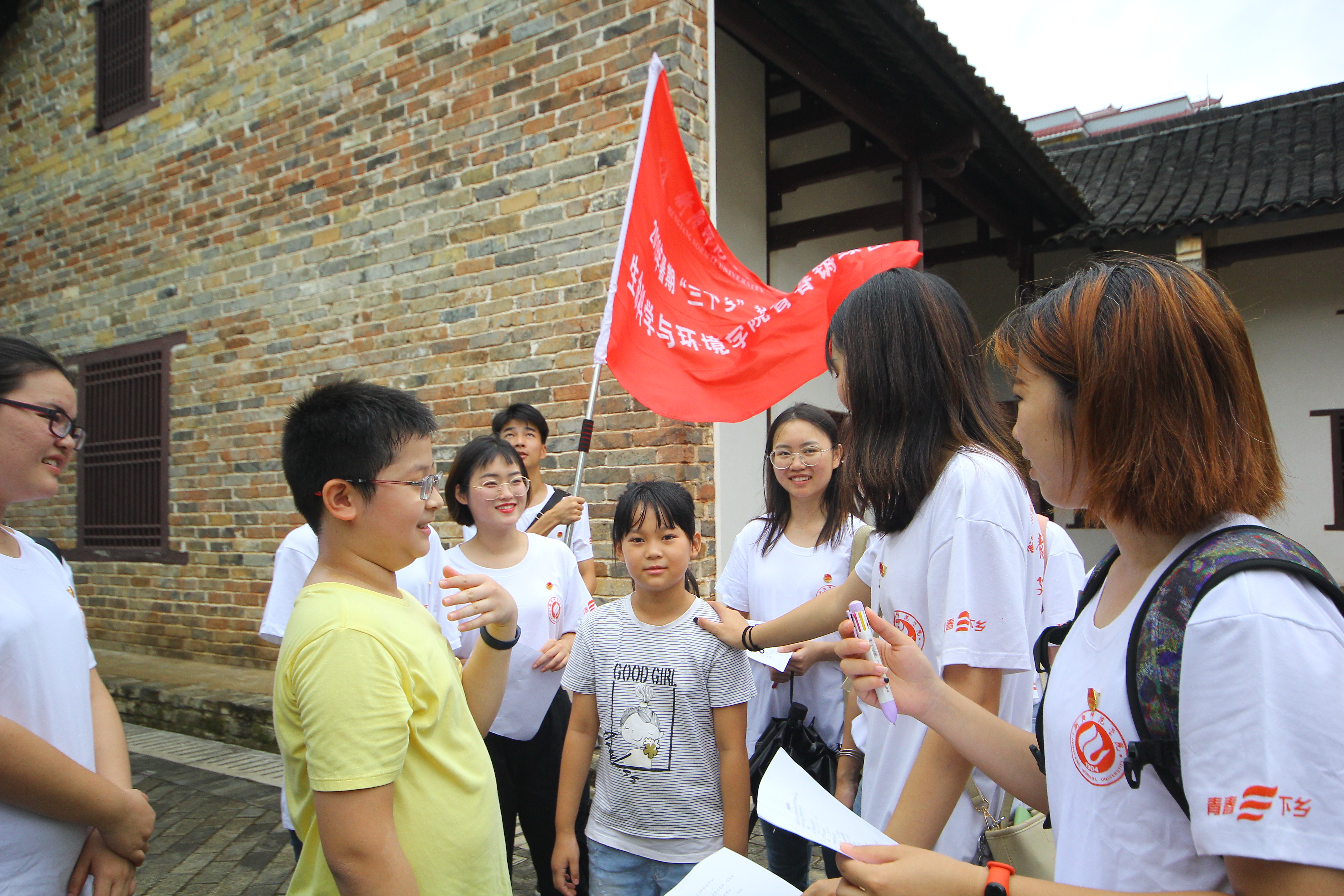 红色背景下的这片土地,青山绿水,环境宜人,有着江南地方独有的柔情温意。细赏美景的同时,志愿者们也不忘本次实践的宗旨与目标,其中一支小队伍——环保问卷调查小组的几名志愿者积极与来往参观的游客交流。一位正在就读小学四年级的小男孩便参与了和这群大哥哥、大姐姐交流感想和体会的“沙龙会”当中。志愿者们被小男孩的可爱与机智所吸引,抛出一问——“你知道国际环保日是哪天吗”,让人意料之外的是,他毫不犹豫地将答案说出。